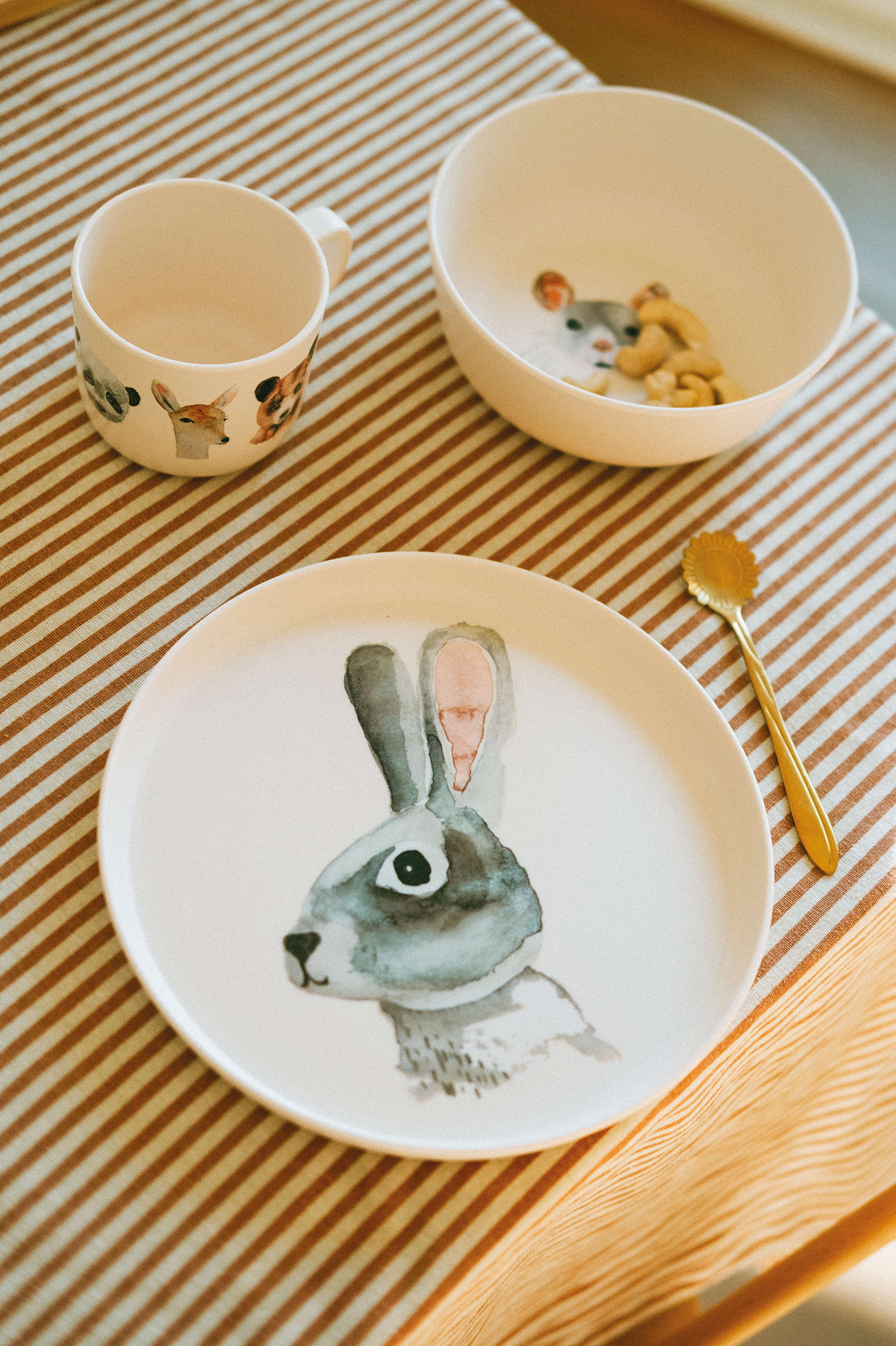 The bunny plate is a lovely highlight for every meal. With its detailed watercolor bunny motif, it will quickly become your child’s favourite. The plate has a practical high rim (diameter 21 cm) so that food doesn’t spill easily – ideal for small children’s hands.